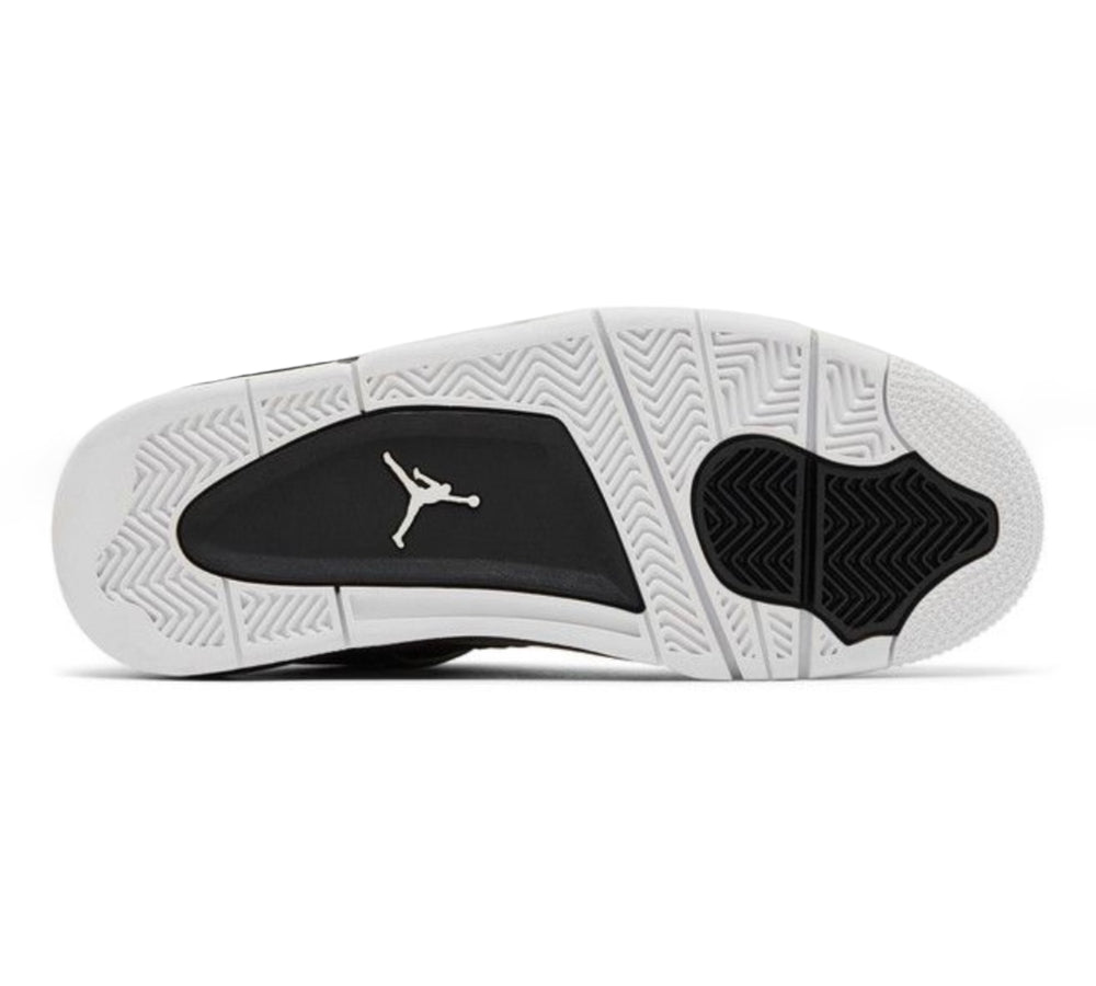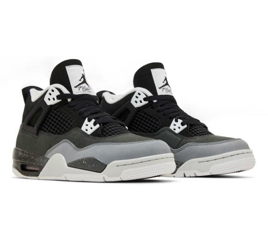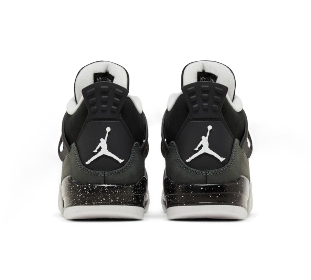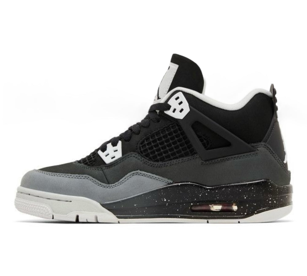 The Jordan 4 Fear upper is crafted from open-weave mesh in black with layered nubuck overlays in Anthracite and light gray. Signature Air Jordan 4 elements include the nubuck lace cage, TPU eyelets, and visible Air-Sole units in the heel. The 2024 grade-school Jordan 4 Retro Fear showcases a speckled pattern across the midsole that complements the gray tones. The branding details are oversized, including a white Jumpman logo on the heel and a premium tongue tag with Michael Jordan’s signature.